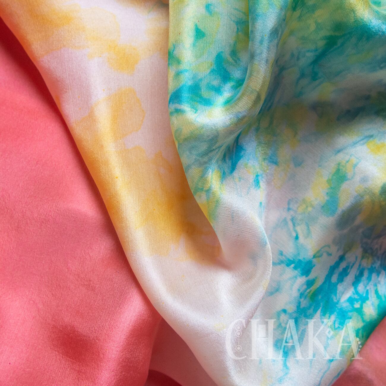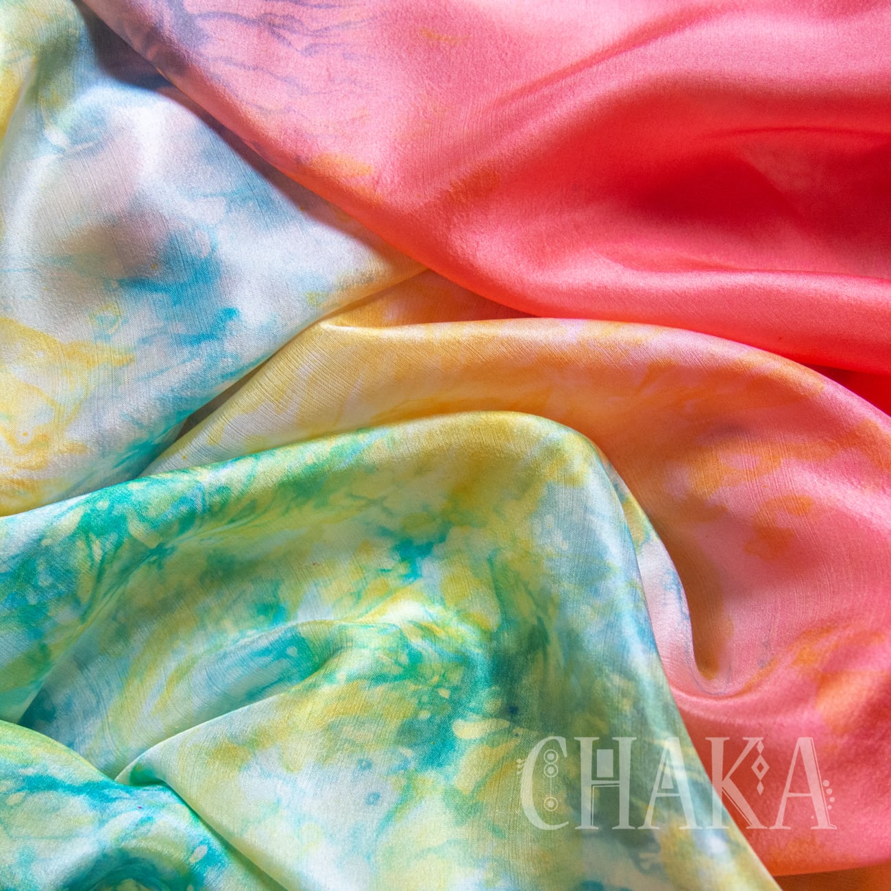 両サイドは珊瑚色のグラデーション、中央は山吹色と空色のむら染め。