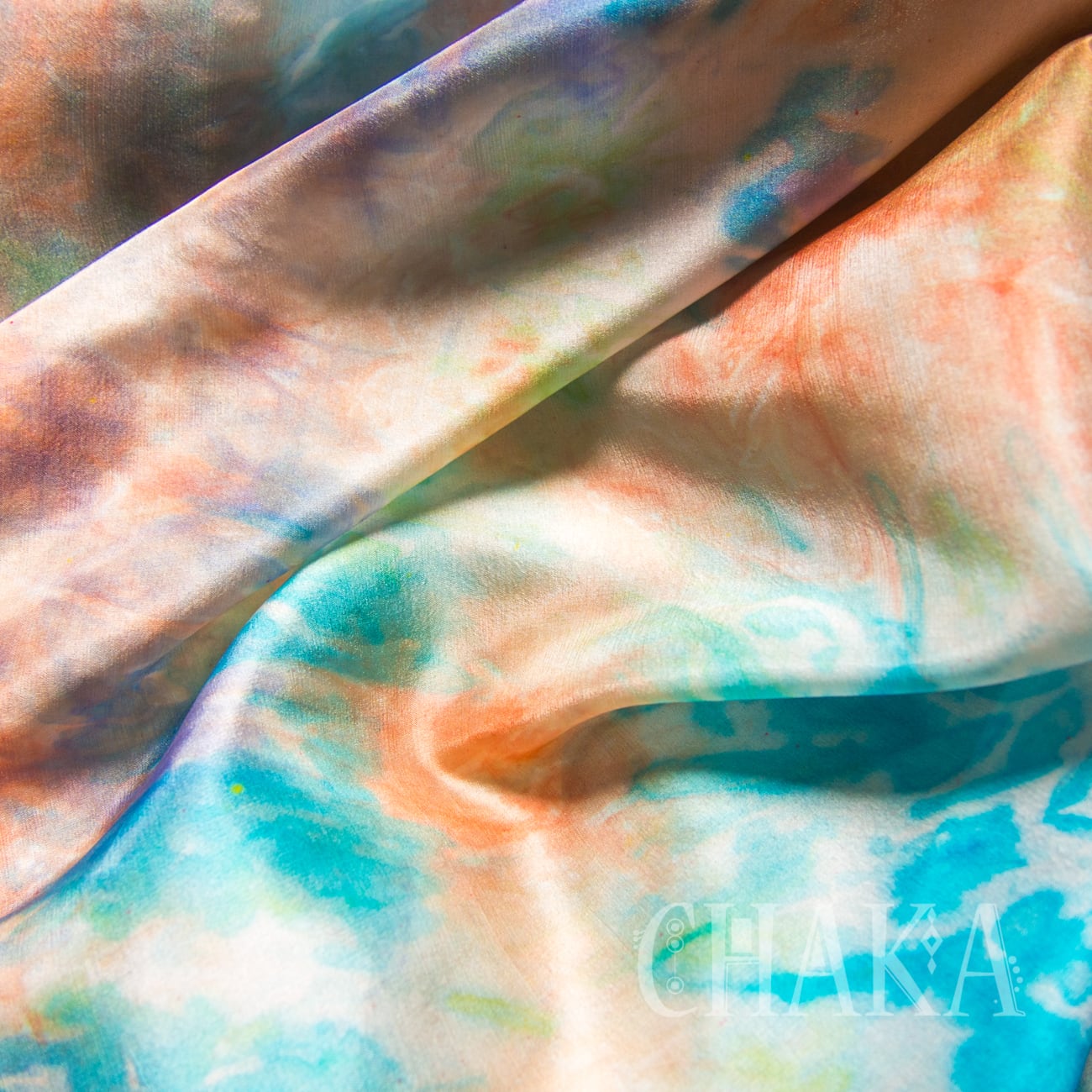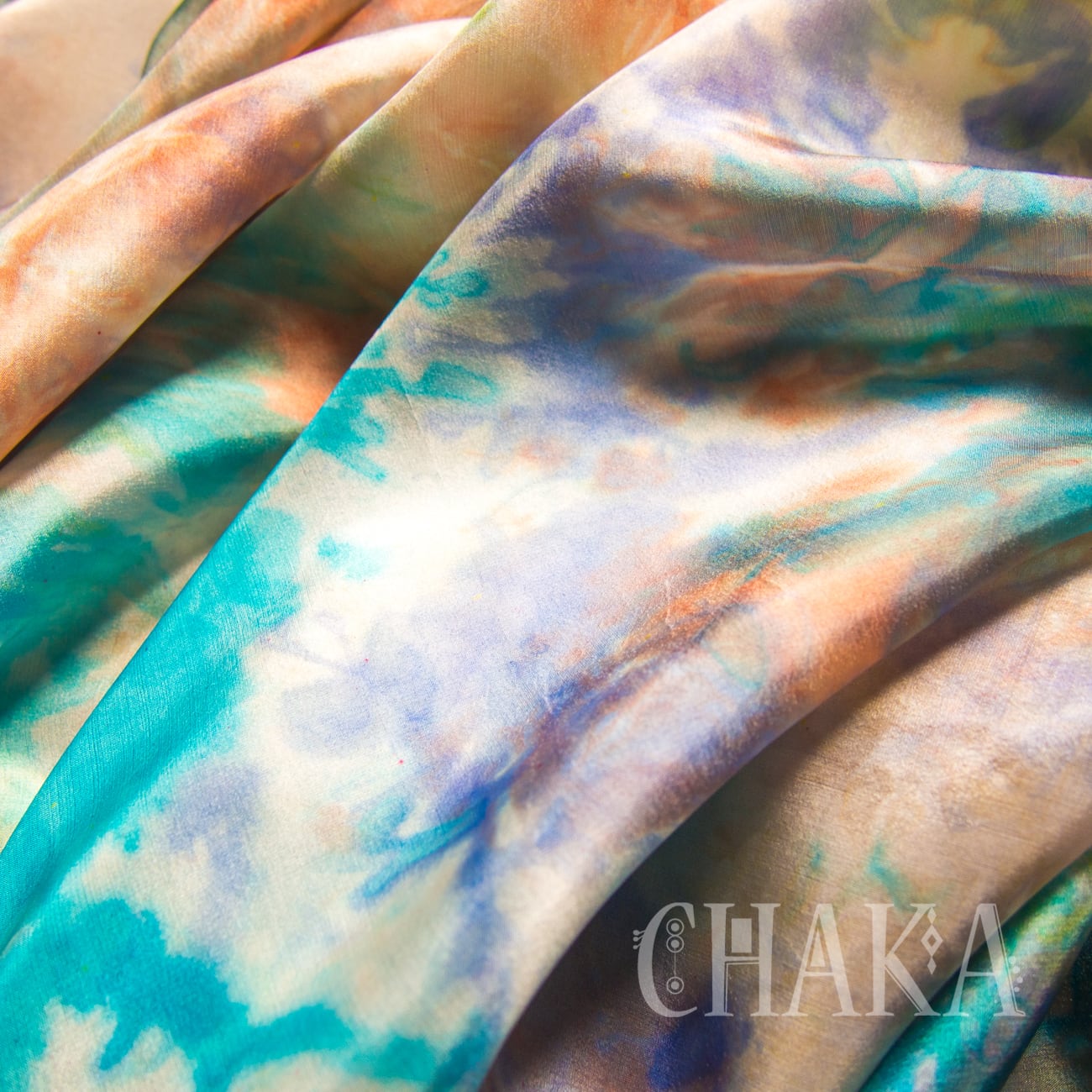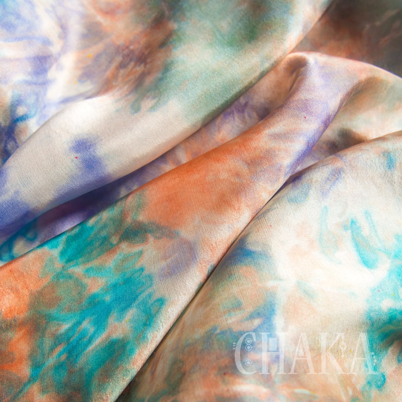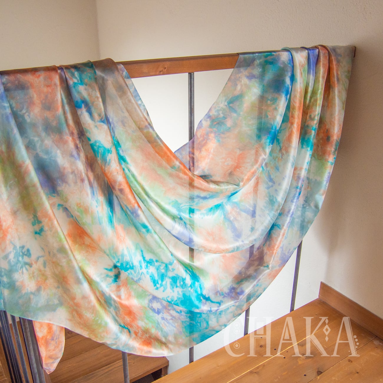 タンジェリンオレンジ、ターコイズブルー、セレストブルー、バイオレットをむら染めで仕上げたシルクベールです。