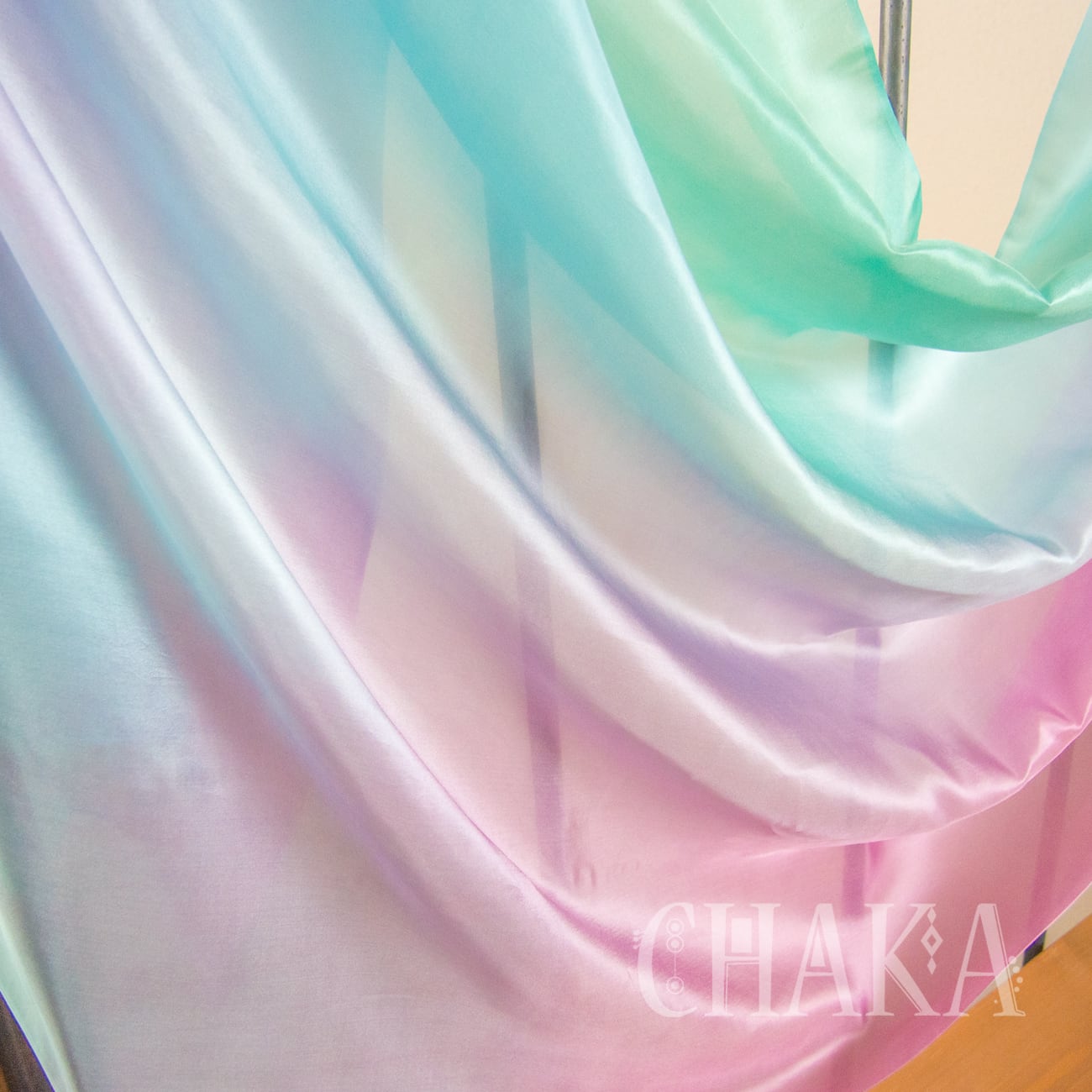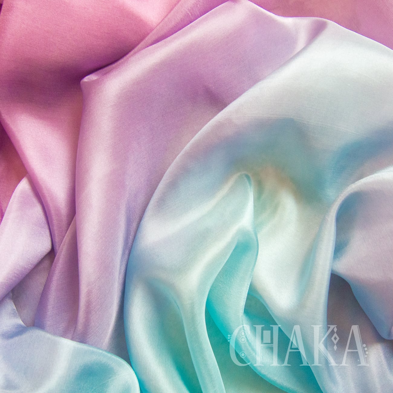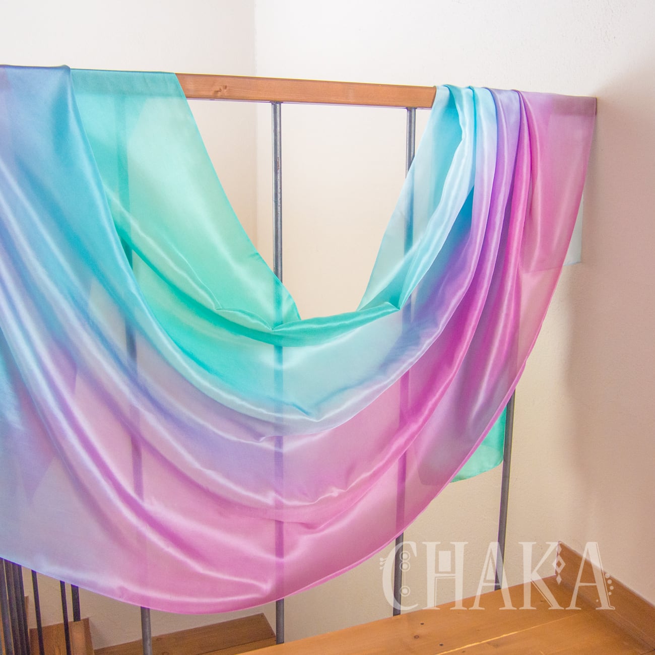 パープル、マゼンタ、ターコイズ、エメラルドをにじませ、重ねて染色したシルクベールです。