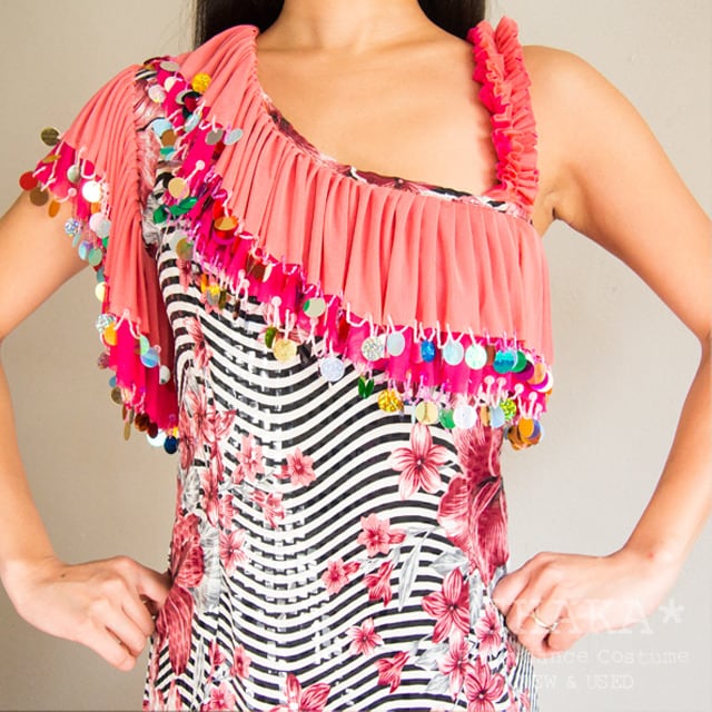 ピーチピンクとマゼンタのフリルには、ストレッチ・チュールレースを使用。