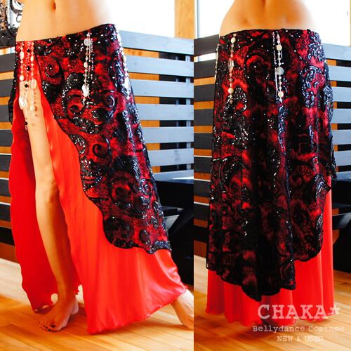 世界的に人気急上昇中のブランド「SCH Fashion」のエレガントなベリーダンス・コスチュームです。女性のセンシュアルな魅力を引き出す赤と黒のバイカラーは、観ているものを惹きつけ、魅了し、一瞬たりとも目が離せなくなるようなデザイン。光沢感のあるゴージャスな赤に重ねた、気品溢れる黒のリバーレース。このレースには黒のスパンコールが散りばめられているので、光を浴びるとキラキラと輝きます。そしてブラとスカートの腰まわりにも、ピンクやオレンジの光を放つスワロフスキーがふんだんにあしらわれています。白と黒のノスタルジックな大粒ビーズが、大人っぽさのなかに少女のようなピュアなかわいらしさをプラス。身につける人を女優に仕立てる衣装です。