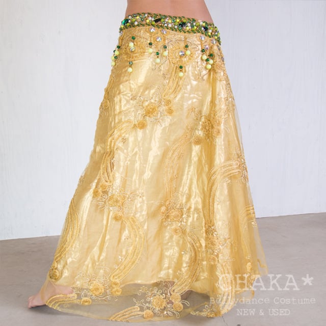 光を浴びてきらきらと輝くゴールドのサテンをベースに、ゴージャスなレースを重ねたスカート。
