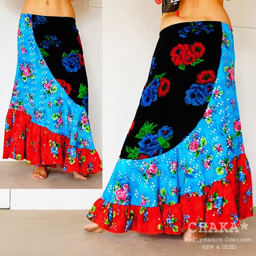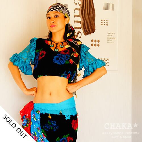 今回のロマ衣装はトップス&スカートのセットで、4パターンのカラーバリエーション。トップスは「チョリ・オフショルダー・フリル」の3タイプがあります。上下ともに花柄の黒のベロアをベースに、スカートは青×赤の大胆でロマっぽい配色。同色の花柄のサテンにはスパンコールが接着されているので、ステージ上での照明映えも文句なしの一着です♪ シンプルにそのまま着用しても、花やスカーフでコーデしてもOK。スカートは片側のみ裾をウエストに挟みこむと、より踊りやすく華やかになります。ただし、25yardスカートとは違って広がらないデザインのため、スカートを使うロマ(ジプシー)・フュージョンでの着用はオススメできません。お洗濯する場合は、中性洗剤でやさしく押し洗いして陰干ししてくださいね。