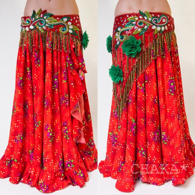 ブラとベルトは赤のベロア、ショルダーとスカートにはスパンコール付きの花柄マテリアルを使用。
