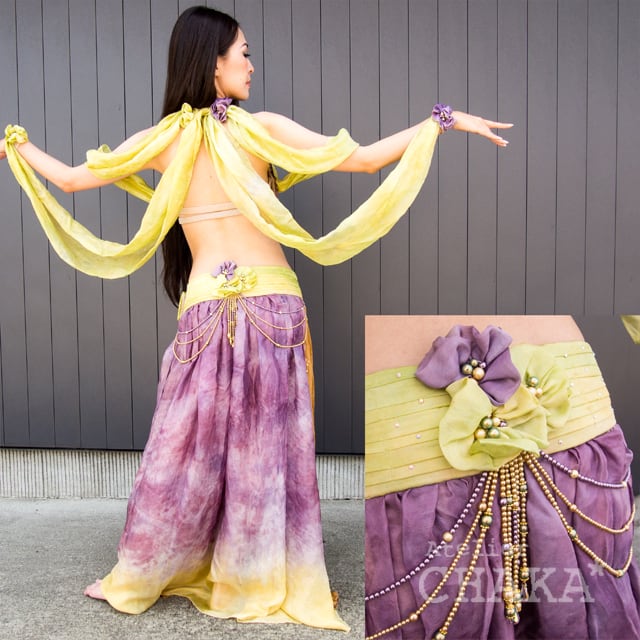 日本人女性の繊麗な魅力を表現するため、手染めしたシルクや紙細工などの天然素材を軸に、ふんわりと空気をまとうような繊細なデザインのベリーダンス衣装を制作しています。