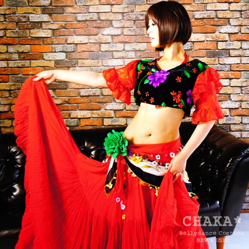 しっかりとした厚みのある上質な黒のベロアには、赤と紫の大輪の花が咲いています。赤のレース仕立てのたっぷりとした袖のフリルが、華やかで情熱的なインパクトのあるデザイン。ジプシー(25yard)スカートは赤・黒・オレンジ・緑・紫をチョイスすると統一感が出るのでオススメです。腰にはオヤスカーフorロマスカーフを巻き、胸元や髪、腰にはお花を飾るとよりロマっぽい雰囲気に♪ お洗濯する場合は、中性洗剤でやさしく押し洗いして陰干ししてくださいね。
