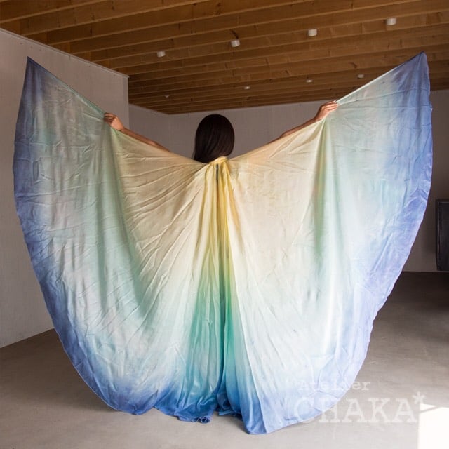 幻想的な蝶々をイメージした配色は、繊細なシルクのなびきを際立たせるよう、やさしくまろやかなグラデーションに手染めしました。