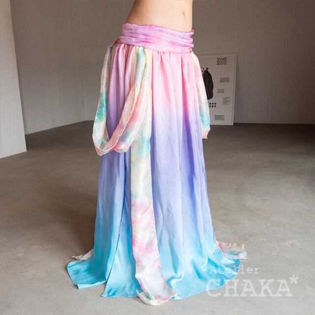 花束をイメージして手染めしたカラーリングは、パネルスカートにマカロンピンク・すみれ色・スカイブルーのグラデーション。