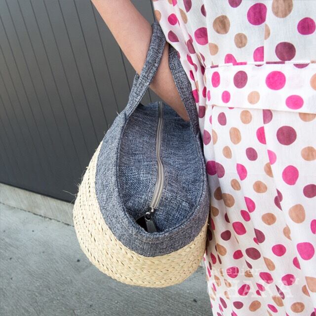 かごバッグの縁と持ち手にはトズールで織られた生地を配し、ファスナーをつけて開閉可能な仕様に。