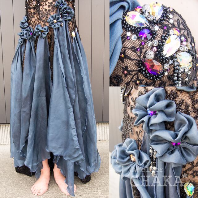 シルクとレースで仕立てた、流麗なワンピースタイプのベリーダンスコスチュームです。