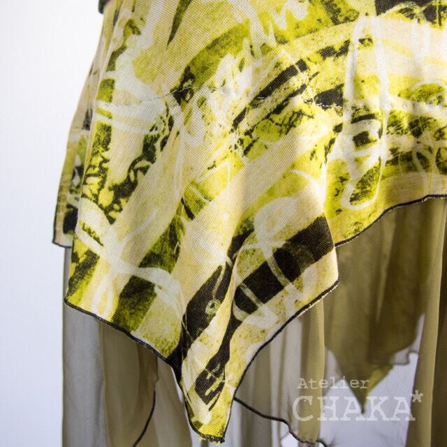アシンメトリーな裾がひらひらと揺らめくスカートに、オリーブグリーンのシフォンを重ねました。