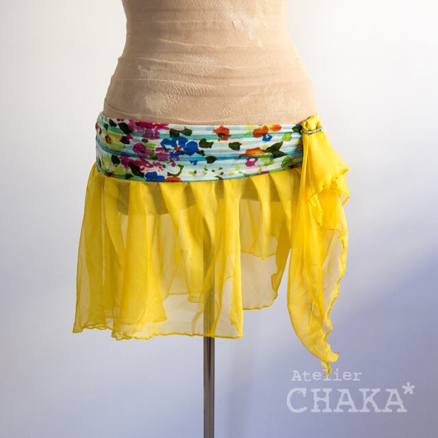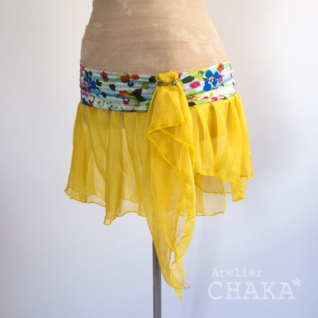 ウエスト部分はあざやかな花柄の2WAY、スカートはカナリヤイエローのシフォン、アクセントにガラスビーズをあしらいました。