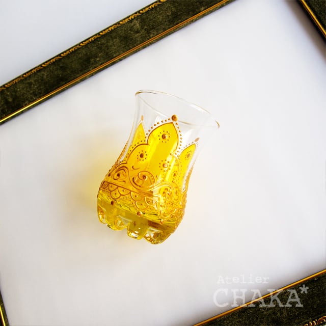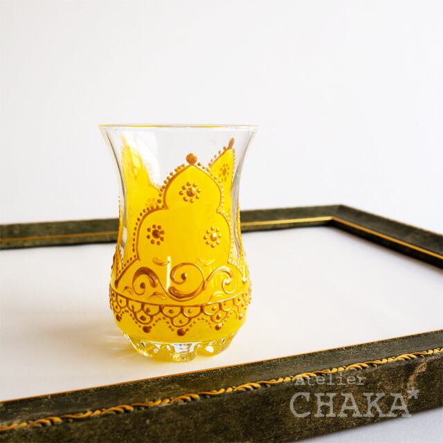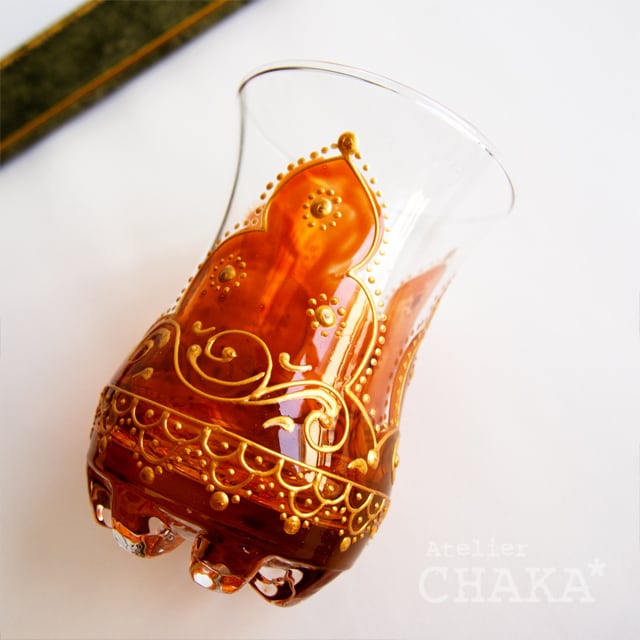 魅惑のチュニジアから、エキゾチックでアラビアンな模様を描いたチャーミングなチャイグラスが届きました。