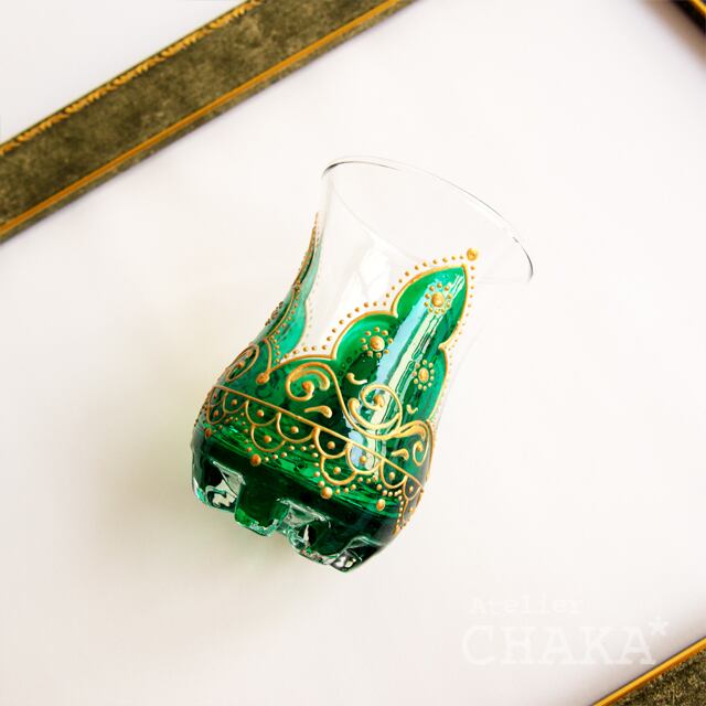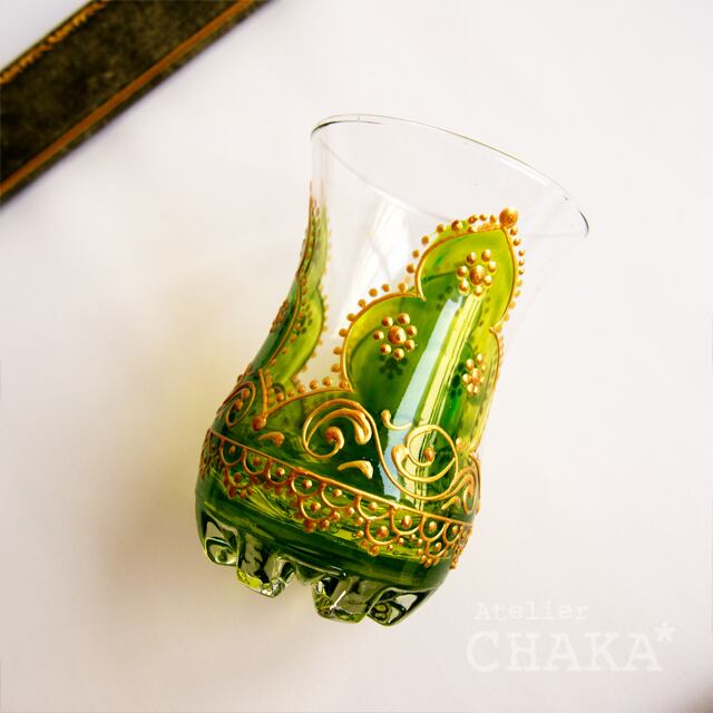 魅惑のチュニジアから、エキゾチックでアラビアンな模様を描いたチャーミングなチャイグラスが届きました。