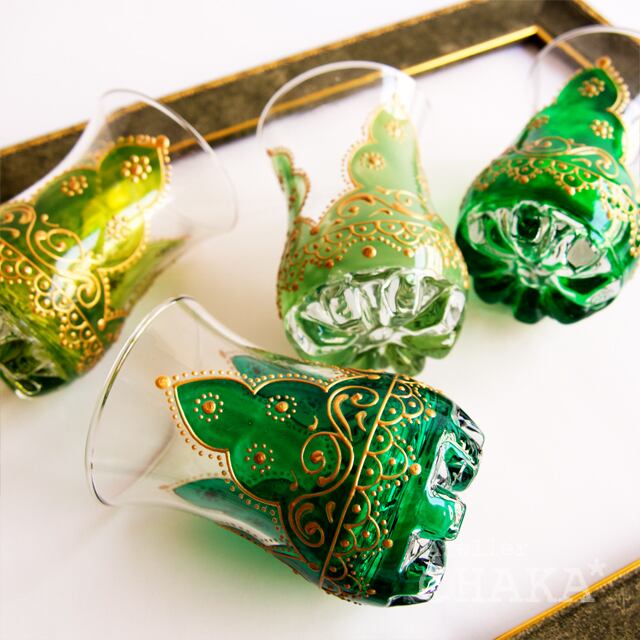 チュニス郊外のガマルタにあるガラス工房で、グラスひとつひとつに職人さんが丁寧に絵付けしたハンドペイントの作品です。