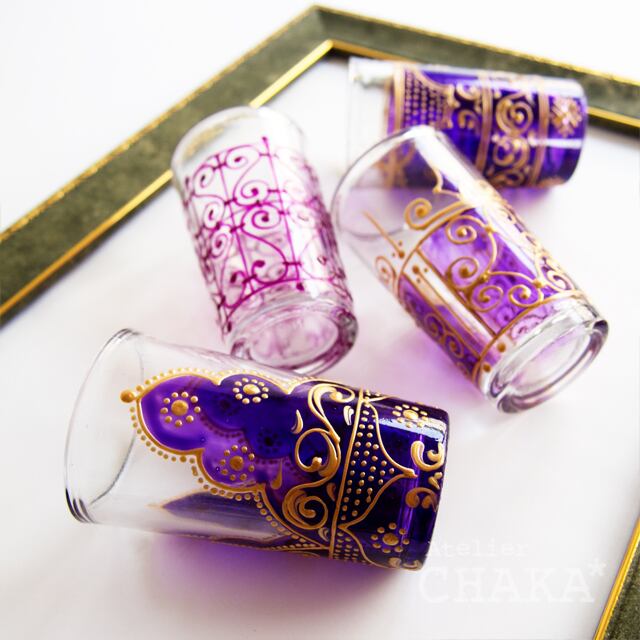 魅惑のチュニジアから、エキゾチックでアラビアンな模様を描いたチャーミングなチャイグラスが届きました。