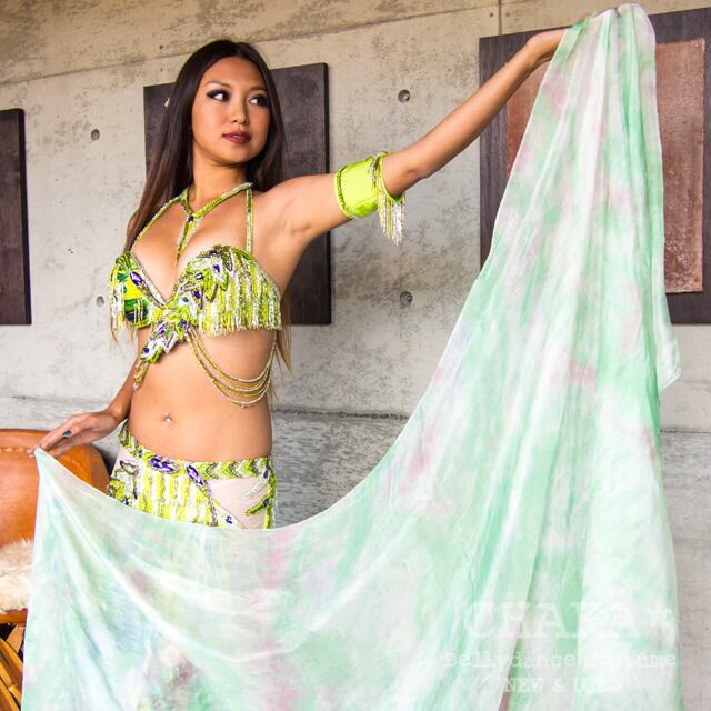 グリーン系のコスチュームに映える配色を計算し、トータルでカラーコーディネートした、店長のMAYOが手染めしたシルクベールです。