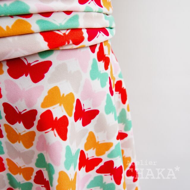 白をベースにマカロンカラーの蝶々がプリントされた、キュートなストレッチ生地を使用。
