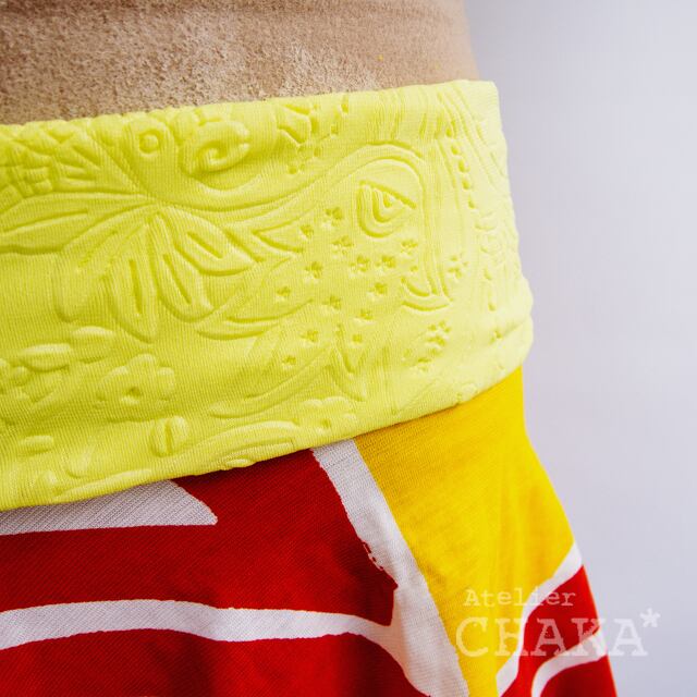 立体的なペイズリーが個性的なネオンイエローのストレッチ生地と、ビタミンカラーのあざやかなストレッチ生地を使用。