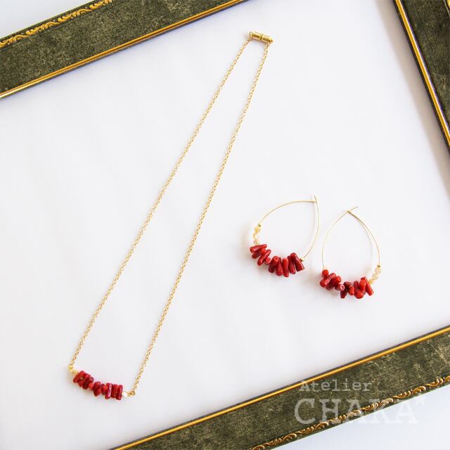 ナチュラルな枝の形を生かした珊瑚にマザーオブパールを組み合わせて、ピアスを製作しました。