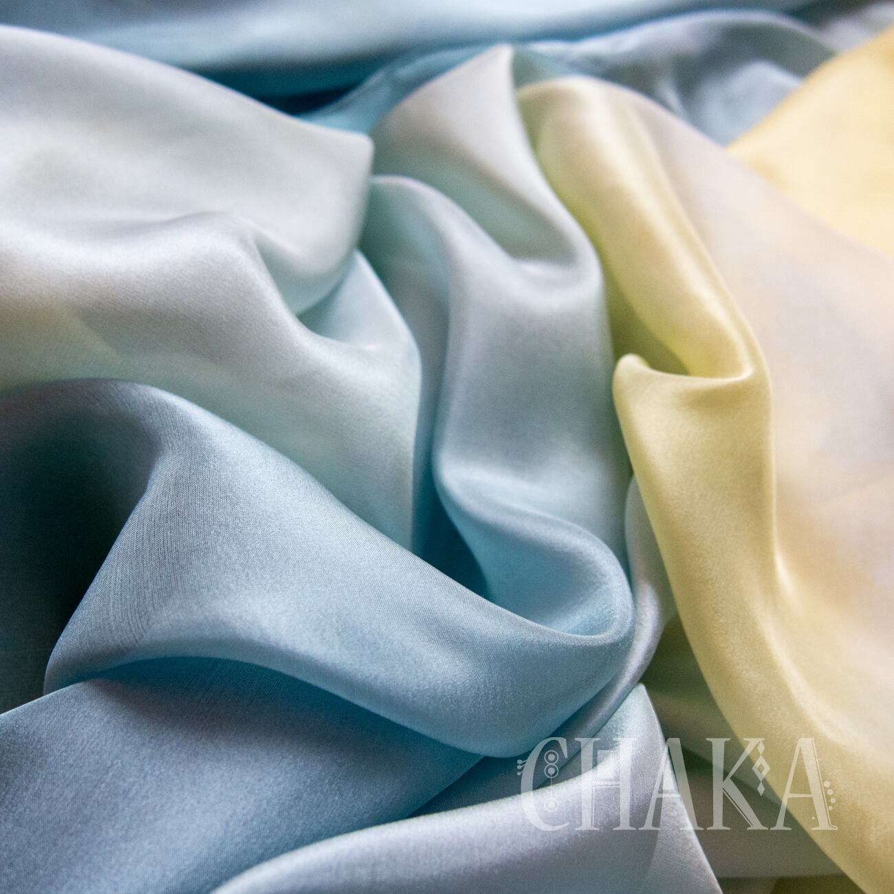 カナリアイエローをやさしくむら染めにしてから、ペールトーンのターコイズを淡くグラデーションに重ねて仕上げました。
