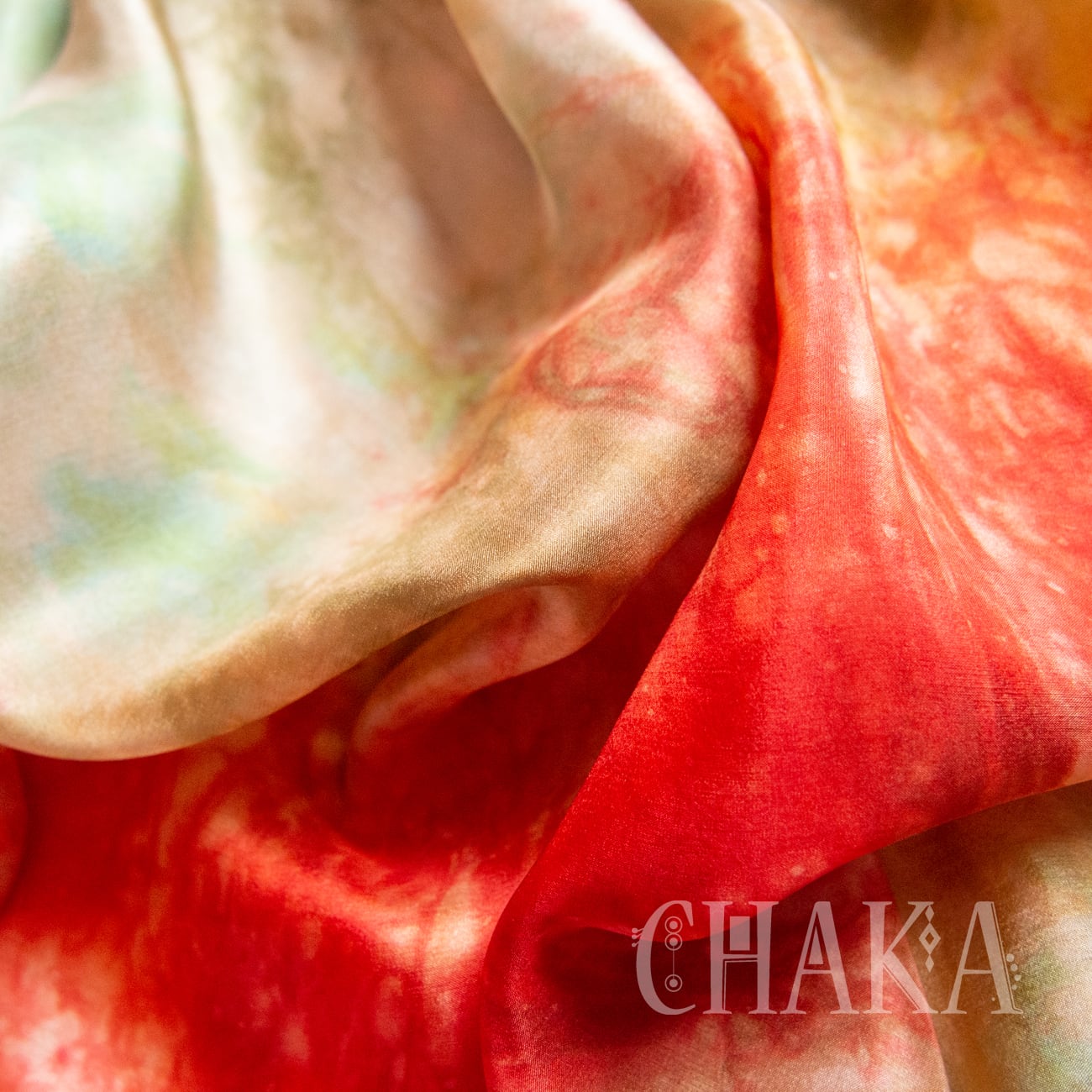 (シルクと絹糸を同色に染めるため、端処理後に染色しています。
