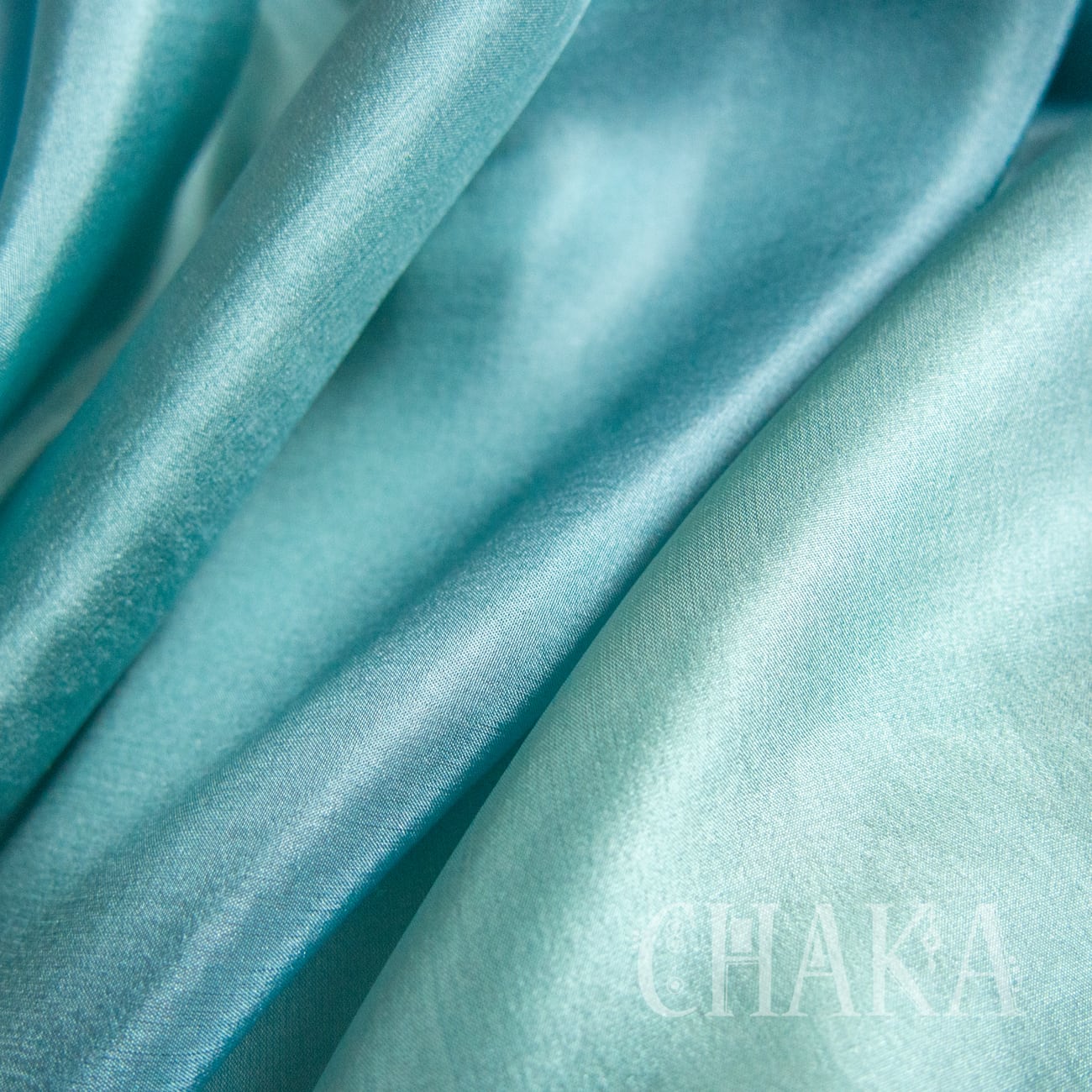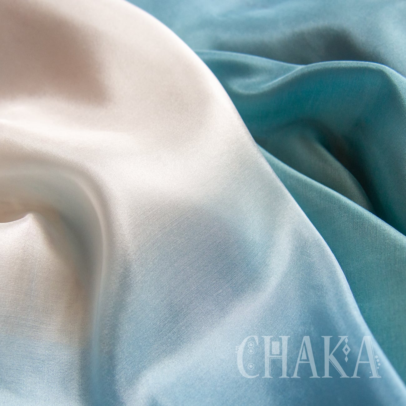 ベールの両端を乳白色、中央部分は薄藍と翡翠色を重ねて青緑のニュアンスカラーに染色しました。