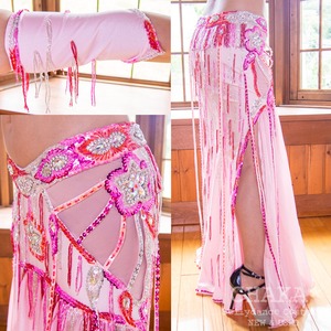 ペールトーンのピンクをベースに、ビーズワークはフーシャピンク、オレンジ、赤。