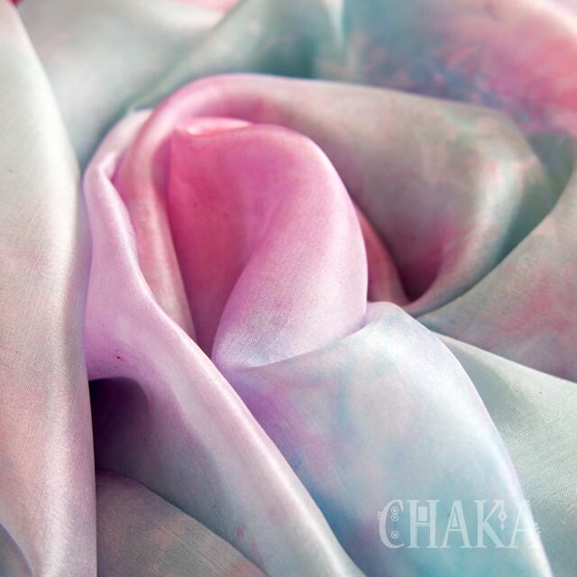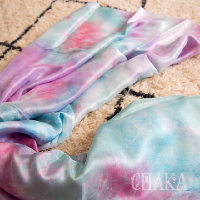 エメラルドグリーン、スカイブルー、パープル、コーラルでむら染めに染色したシルクベールです。