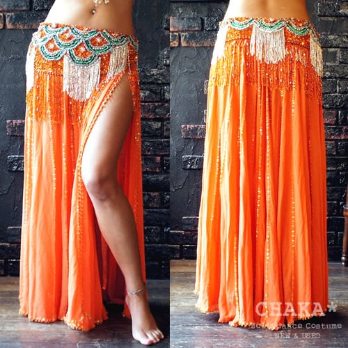 ベリーダンサーがエジプトのモノクロ映画で活躍していた時代を彷彿とさせる、クラシカルなブラ×ベルトタイプのフルコスチュームです。鮮やかなオレンジをさらに引き立てるのが、アクセントカラーの白とグリーン。コントラストの強い配色だけでもステージ映えしますが、ふんだんにあしらったスパンコールとビーズが照明を浴びてきらきらと輝き、光の装飾でダンサーを彩ります。オレンジのシフォンスカートを白やグリーンに替えると印象が大きく変わるので、1着あると数着分に匹敵するセットです。